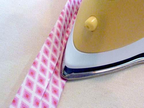 NOTE: As mentioned above, if you are new to working with bias binding, check out our tutorial on Figuring Yardage, Cutting, Making and Attaching. - Fold the completed binding strip in half, wrong sides together, and press to set a center crease.