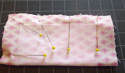 - Fold the tab in half right sides together. Pin in place along the 4″ side and across one end.