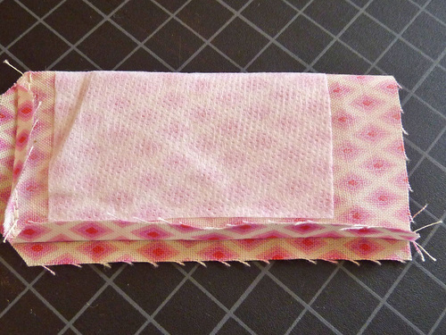 - Find the 4″ x 3½” fabric rectangle and the 3″ x 3″ interfacing square. Center the interfacing on the wrong side of the fabric.