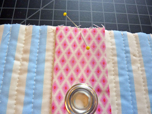 - Wrap the binding up and over to the back of the pocket panel. Pin the folded edge in place at the back. That folded edge should cover and fall below the seam line.