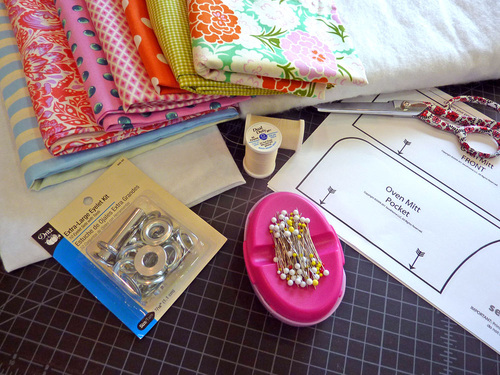 NOTE: As mentioned above, each oven mitt uses four fabrics. Of course, you could reduce the variety if desired, but part of the fun of this project is the colorful mixing and matching. The quantities below are for ONE hot pad.