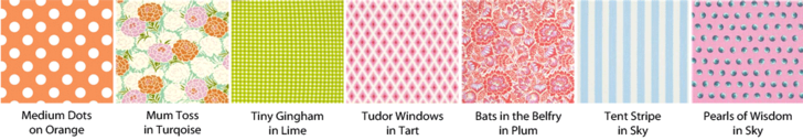 Tudor Windows in Tart, Bats in the Belfry in Plum, Tent Stripe in Sky, and Pearls of Wisdom in Sky – all from the Elizabeth collection by Tula Pink for FreeSpirit Fabrics (originally used for both our Market Tote Trio and our Tudor Style Apron)