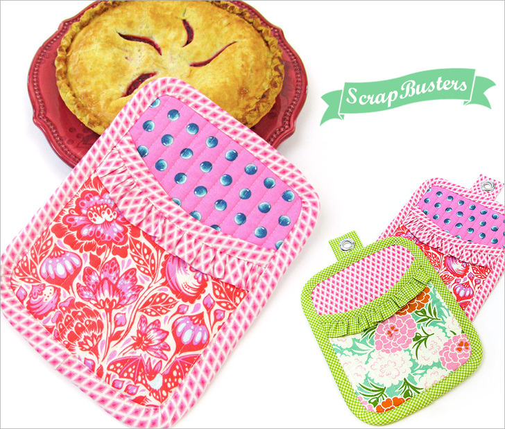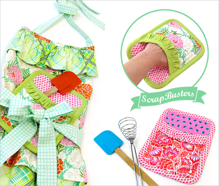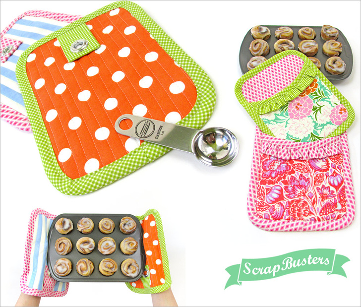 As maker’s, it’s time we fess up: scraps are a bit of an addiction. When we love a fabric, it’s hard to say goodbye after just one project. So into the stash basket they go, bits and pieces we can’t wait to use again. This ScrapBusters project is a great reason to pull out some of the prettiest, most colorful fabrics from your scrap stash. Blend them together into a happy mix of pattern and color. Each oven mitt uses up to four different fabrics. Wouldn’t these make a great wedding or housewarming gift?
