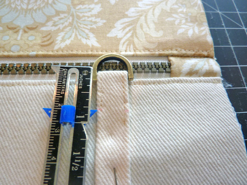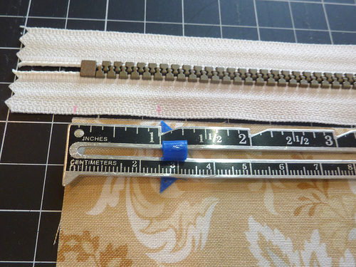 - Repeat to mark the opposite end of the zipper tape. The fast way to do this is simply measure 8″ from the first line and 7″ from the second line.
