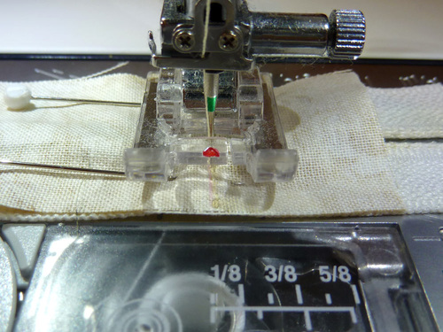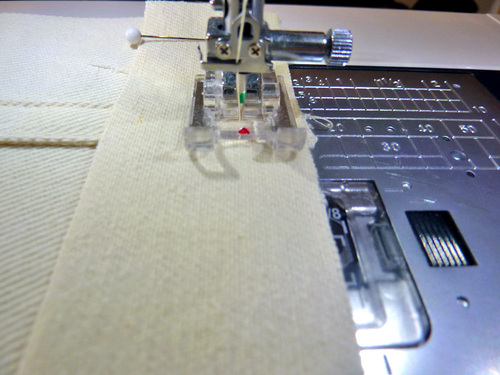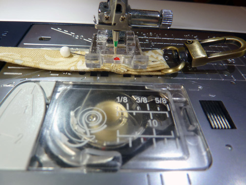 - Stitch across along the drawn line to secure each folded loop in place. Our Janome machine allows us to move the needle position to the extreme right, making it easy to stitch along the drawn line without having the presser foot hit the D-ring.