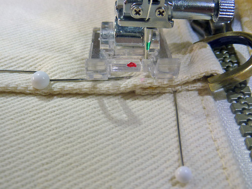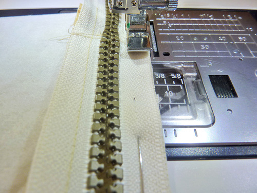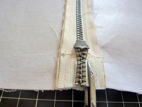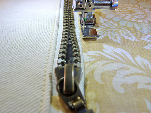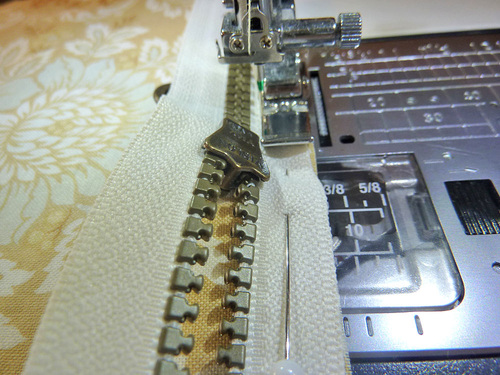- When you can start to feel you’re approaching the zipper pull, stop with your needle in the down position. Carefully twist your fabric around slightly and carefully close the zipper. Re-position your fabric and finish sewing to the end. Be very careful and go slowly; you want your seam line to be super-duper straight.