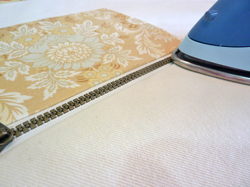 - Align the bottom and side seams. The top folded edge of of the lining should fall below the zipper teeth by about ⅛”. If it doesn’t, adjust the fold to fit and gently re-press.