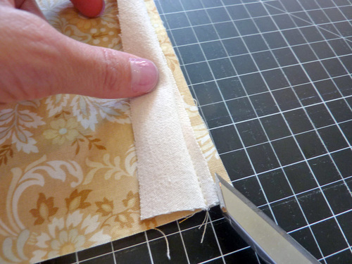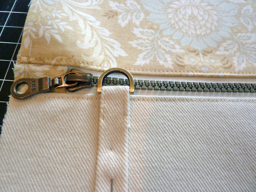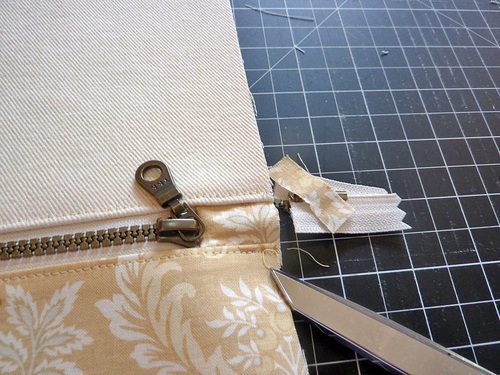 - At the pull end of the zipper, trim away the excess tab fabric and zipper so the side edges are flush.