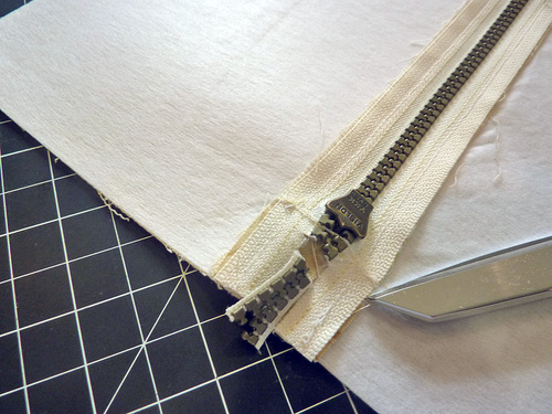 - In addition, cut away the excess zipper teeth so you can more easily stitch front to back without this extra bulk. Clip along the zipper teeth, getting in as close as possible. You are not cutting into the fabric, just the zipper.