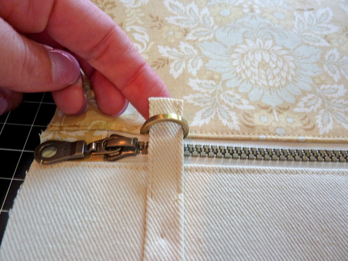 NOTE: You will need to kind of “poke out” the ends of zipper through the zipper opening in order to stitch the lining into place all the way around. Once the stitching is done, simply poke the ends back to the inside and gently push the zipper tabs back into place.