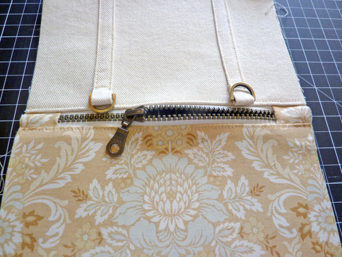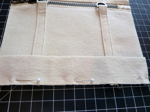 - Fold the top end of each strap back on itself around the D-ring. The end should fold back approximately 1″ so the top of the folded loop butts up against the bottom edge of the zipper teeth. Pin the fold in place.