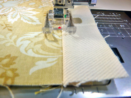 - Find the two 1″ x 6″ strips, which should be in the same heavier solid fabric as the back panel.