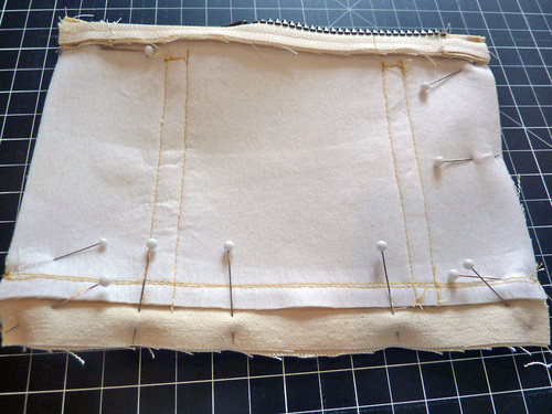 - Pin the layers together along the edge of the zipper.