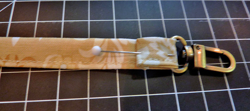 - Slip one raw end of the strap through one swivel hook. Fold back the raw end ¼” then fold an additional ½”. Pin the folded end in place over the swivel hook.