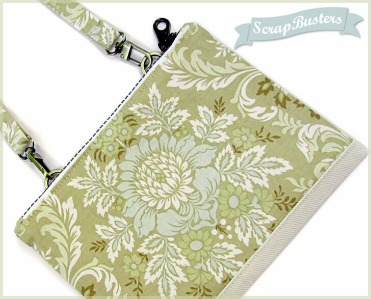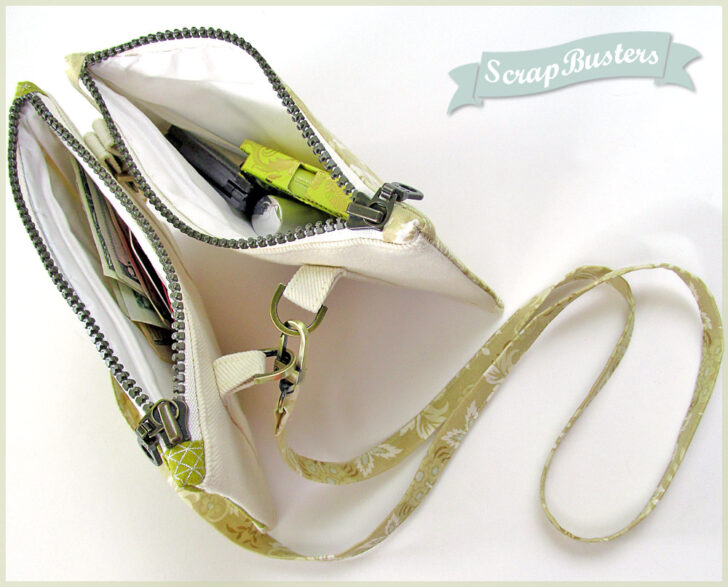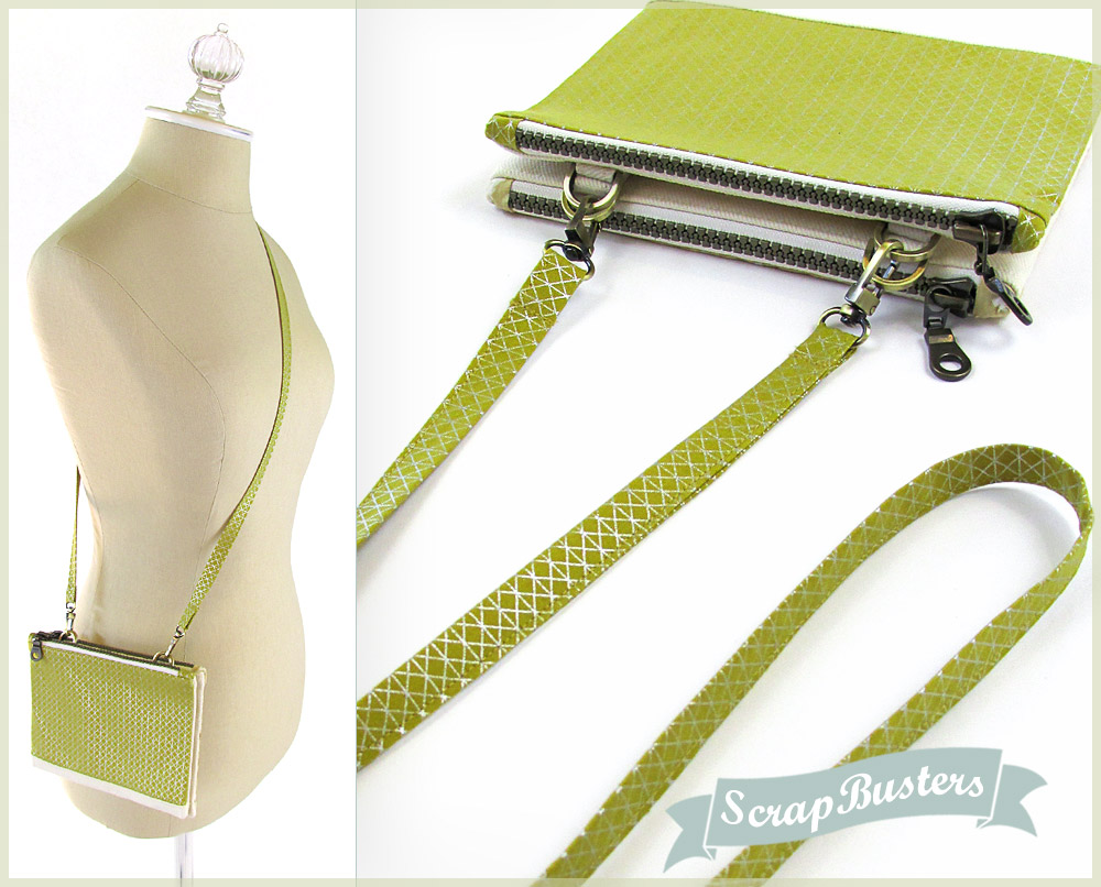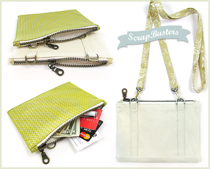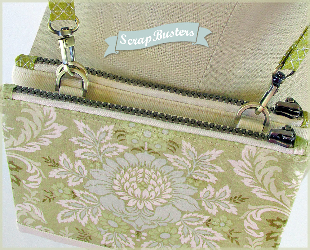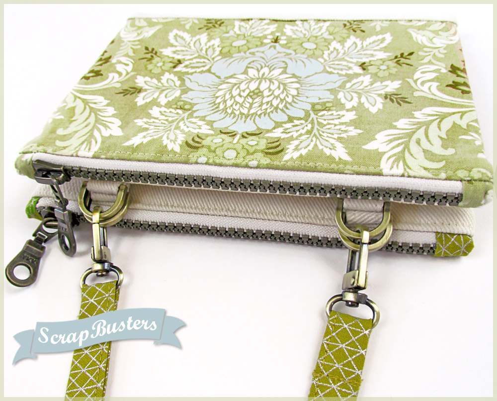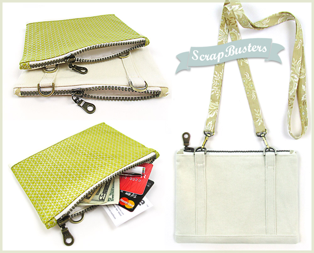 So nice, we made them twice. Not just as two sample options, but as two coordinated pouches designed to clip together. Take one or take both. Turn them into a mini shoulder bag or ditch the strap and toss one or both into a larger tote. Stash money and cards in one, make-up and extra necessities in the other. So many options – it’s the ultimate in mini-pouch flexibility. They’re precisely matched in size and shape so they clip together perfectly. All this, and as a ScrapBusters project, you can make a set from the great fabrics lurking in your stash.