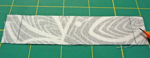 - With a fabric pen or pencil, mark horizontal stitching lines at each end of the hinge tab, ½” in from each end.