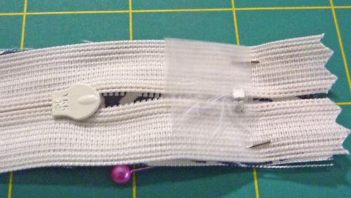 - Place the tab right sides together with the bottom end of the zipper. The marked stitching line on the tab should sit just above the bottom zipper stop. Pin in place.