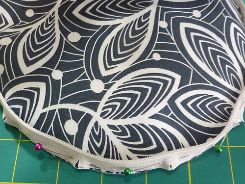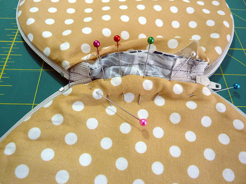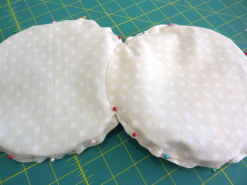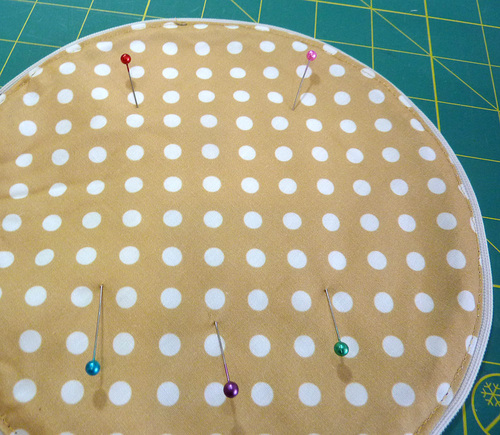 - Find one lining circle. Place it right sides together against one exterior circle. The raw edges of the two circles should be flush all around. Pin in place, leaving an approximate 3-4” opening along the zipper tab (the hinge).