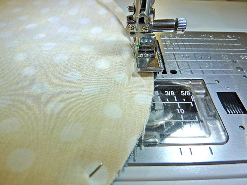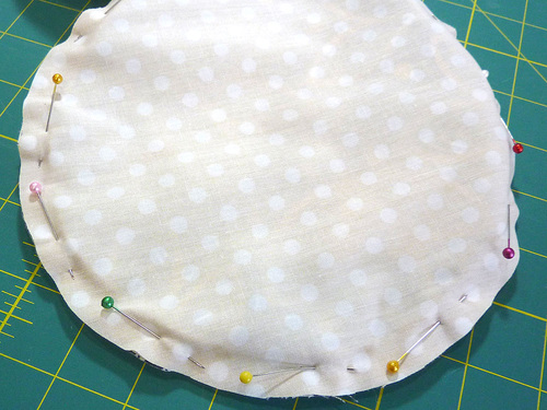 - Along one circle, fold under the raw edge of the opening so it is flush with sewn seam. Pin in place.