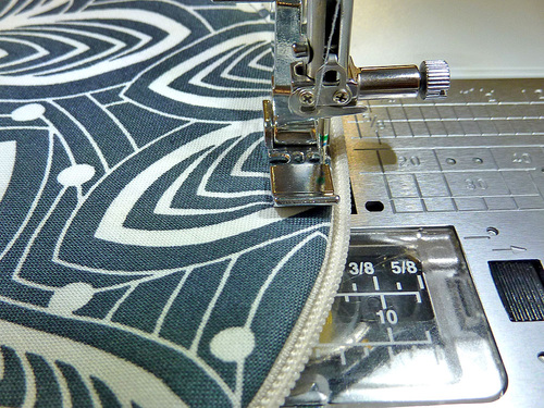 - Still using a Zipper foot, stitch both lining circles in place, starting and stopping both seams at either side of the openings over the hinge. Your seam allowance is approximately ¼” – ½” – as above, the goal is to stitch as close to the zipper teeth as possible.