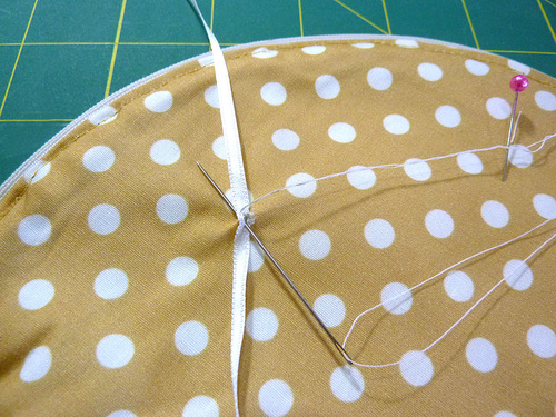 - Hand tack the ribbon in place, matching the center point of the ribbon to the marked dot. You are stitching just through the lining and the fusible batting; your stitches should not go through to the exterior.