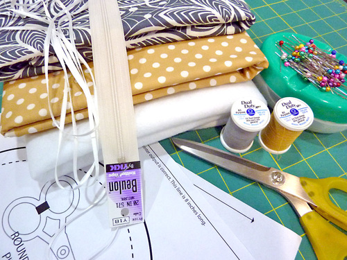 As noted below, we worked with a 20” zipper and the provided 8” circle pattern. You can adjust the size of circle smaller or larger as well as the length of the zipper to best suit what you’d like to store in your case. Refer to our original Circular Zipper Tutorial for the math formula needed to figure out the appropriate length for the tab that creates the case’s “hinge.”