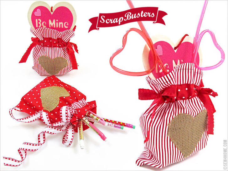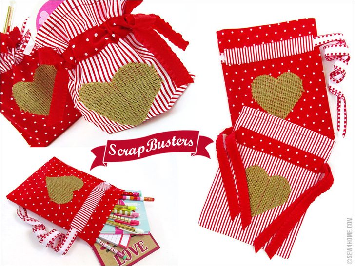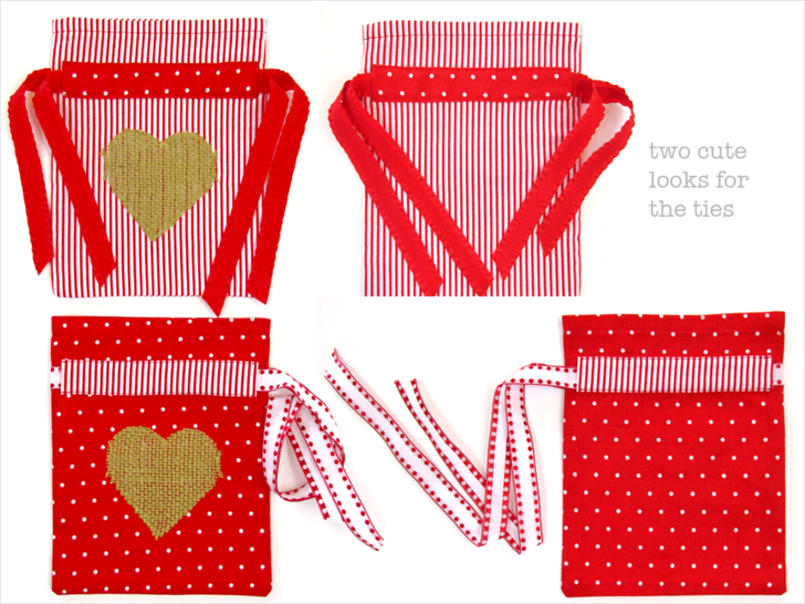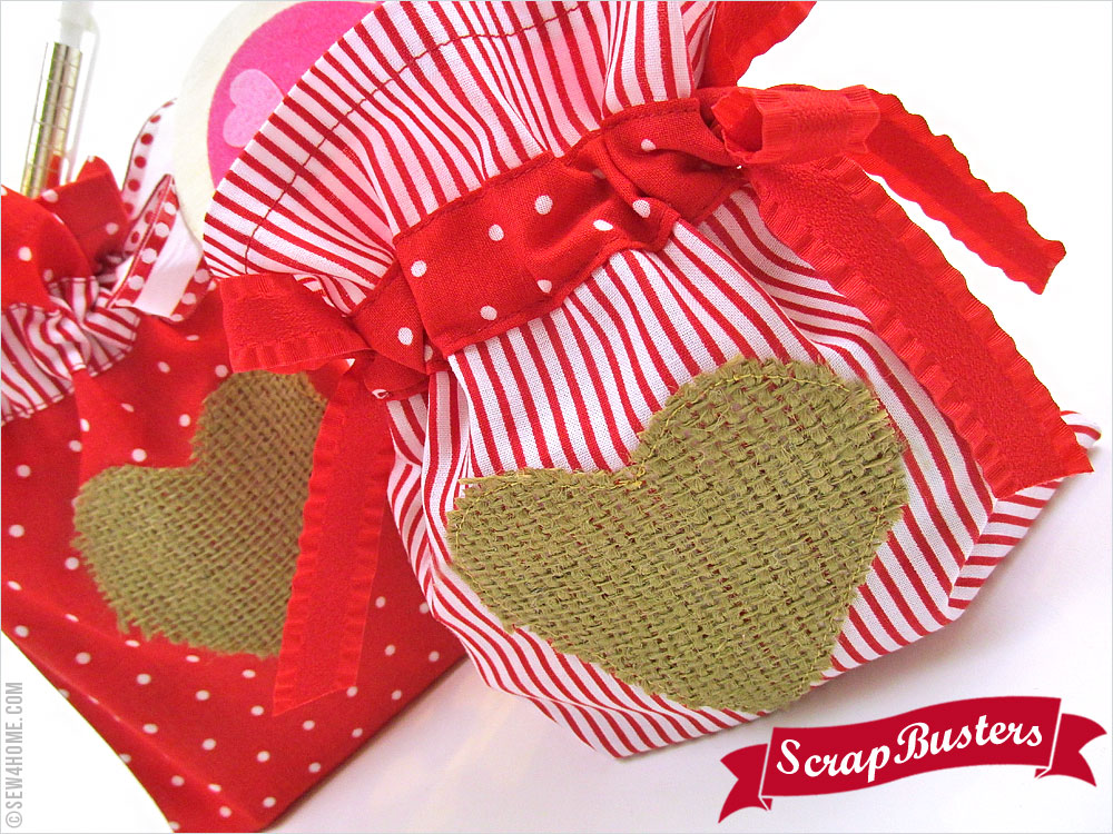 Pull out your scrap stash for today’s quick and easy project. Our Valentines mini gift bag set features burlap and ribbon accents and unique side ties. We added simple casings as our closure solution, and give you two looks for the ribbon ties. Cut your ribbon in half for matching petite side bows or thread a long length from front to back and make a single side bow… kind of like the 80s side pony – I loved the side pony. Cute burlap hearts add the perfect touch to say, “Handmade just for you, my Valentine.”