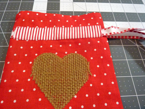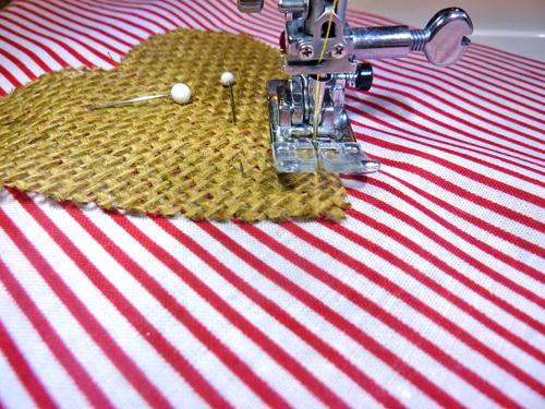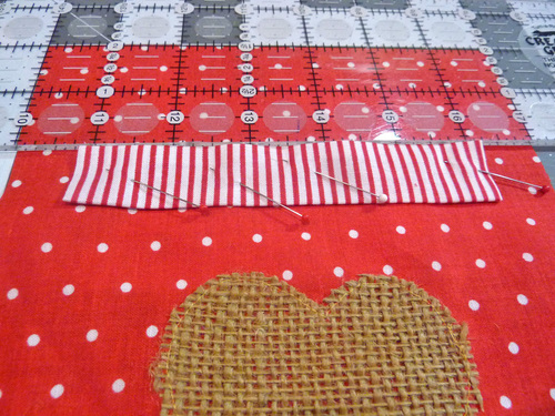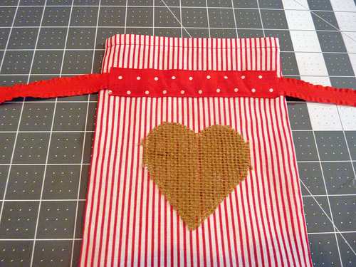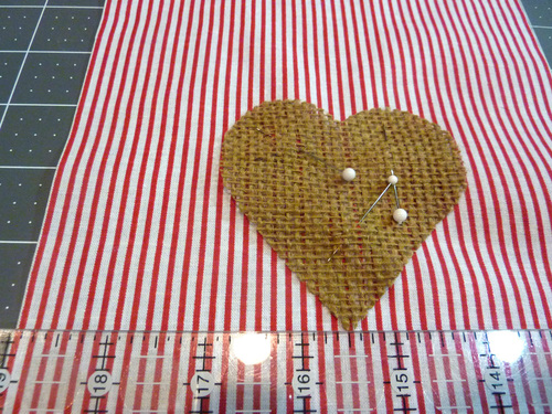- Place one burlap heart in position on each rectangle. The bottom point of the heart should be 2″ up from the bottom raw edge of the fabric rectangle and centered side to side. Pin in place.