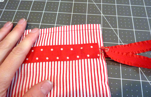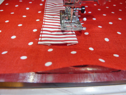 - Place a casing strip on each rectangle. The design is to mix and match the casing fabric and the bag fabric (ie. striped casing on dot panel).