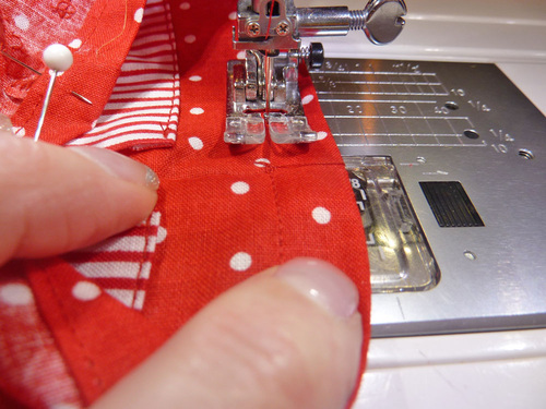 - Re-thread the machine with thread to match or contrast with the casing strips. We used a red thread for both bags.