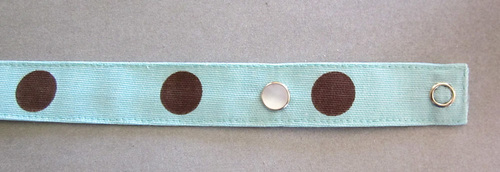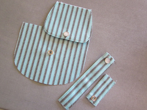 - Apply snaps to the marked positions on the completed flap (the top-pearl half), one pouch piece (the bottom stud half), and ½” from the finished end of each strap (pearl half on the long strap, stud half on the short strap).