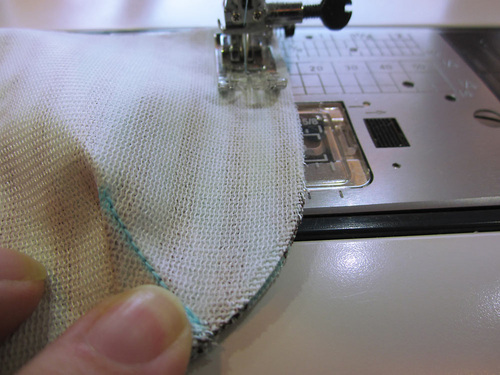 - If necessary, re-thread the machine with thread to best match the fabric in the top and bobbin. Slightly lengthen the stitch. Edgestitch along the entire curved edge; the straight top edge is still open.