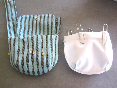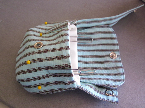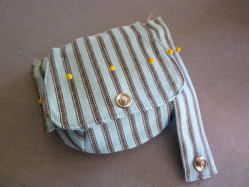 - Pin the flap to the pouch, centered between the side seams. The flap should be right sides together with the pouch, which means the bottom half of the snap will be facing up.