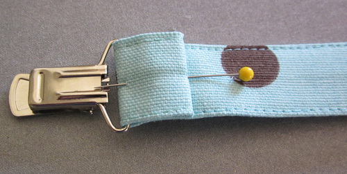 - Thread this end through the suspender clip, brining it through approximately ¾” and encasing the raw edge of the first fold. Make sure this folded edge is at the back of the lanyard (the side of the lanyard that does not feature the pearl head of the snap). Take a minute to close your snap and double-check you threaded the suspender clip in the right direction.