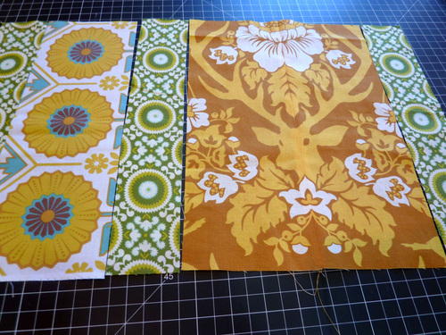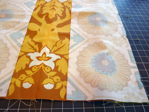 Our design features a bold motif in the center with mirror-image strips to either side. We really wanted to use the beautiful Joel Dewberry dear motif as our center image, but the scraps we had didn’t have a complete motif that was quite wide enough. That doesn’t stop a dedicated S4H sewer! We fussy cut two strips and pieced them together. The center seam disappears within the design, and we could then trim down the resulting panel to our required width. Can you spot the seam?