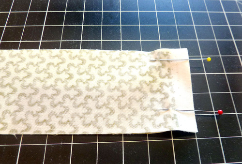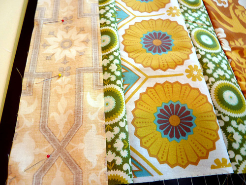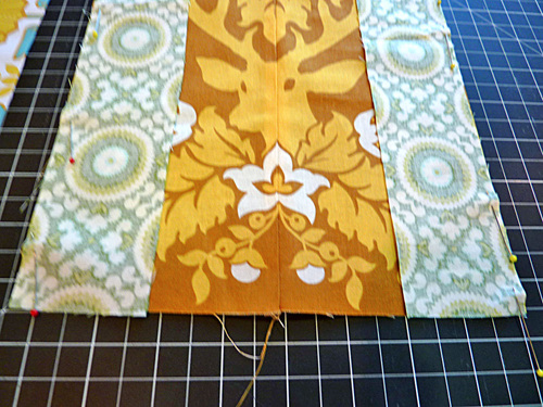 - To do this, start with the first two strips to either side of the main center panel. Place these strips right sides together and pin in place.