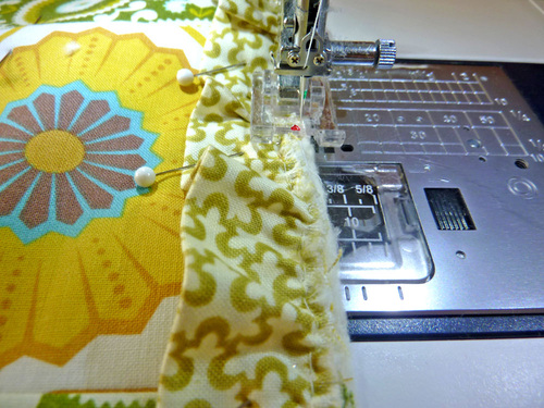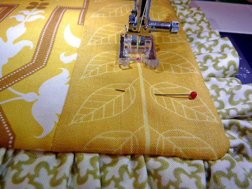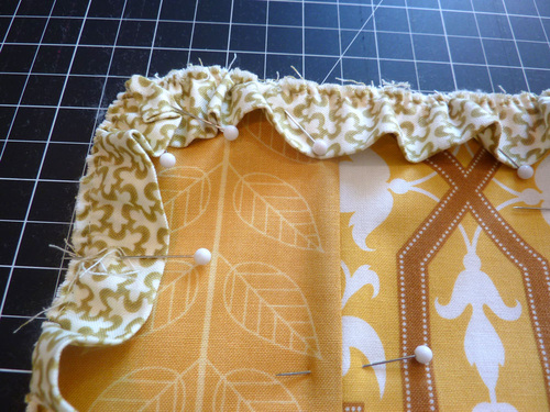 - Pin the ruffled loop around the entire perimeter of the runner. Adjust the gathers as needed so the loop fits flat against the runner. The raw edges of the gathered loop should be flush with the raw edges of the top panel/batting. Use extra pins in each corner to keep the gathers flat.