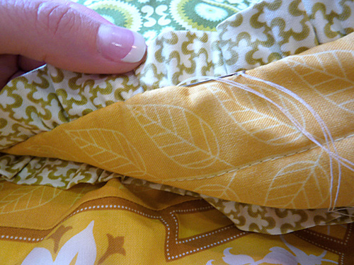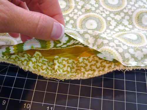 - Find the trimmed back panel. Place it right sides together with the top panel, sandwiching the ruffle between the layers. Pin all around, leaving a 6-7″ opening along one end for turning.