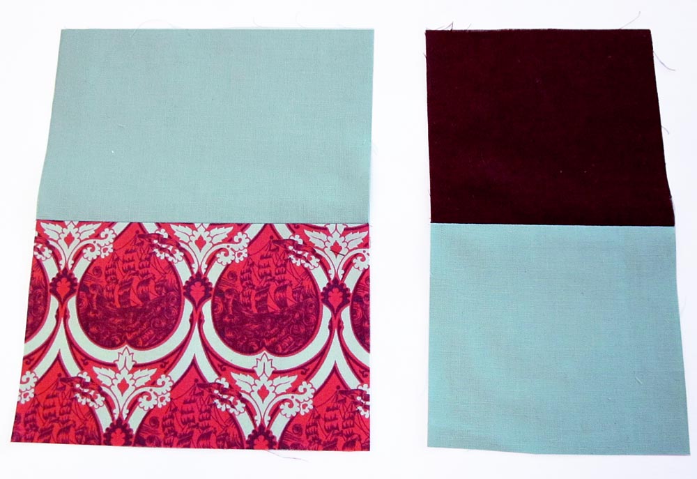 NOTE: You can use either of your solid scraps for the back; we chose Turquoise for our back. - From the solid fabric for the upper right quadrant (Burgundy Designer Linen in our sample), cut ONE 5″ x 5″ square.