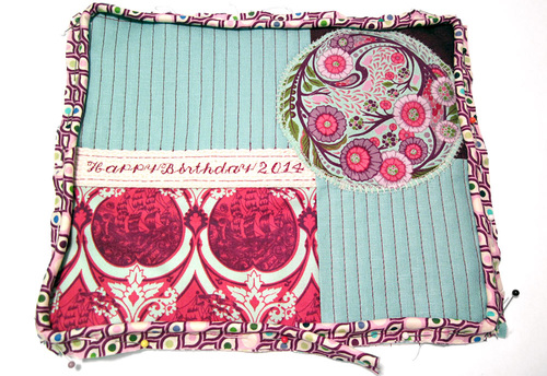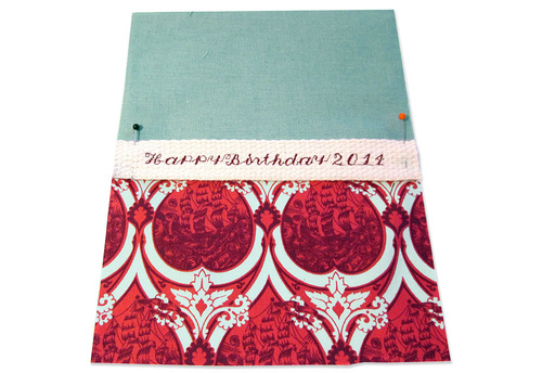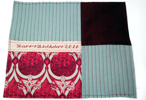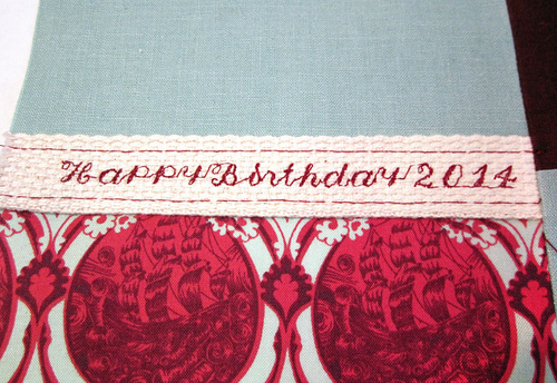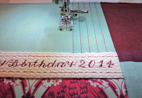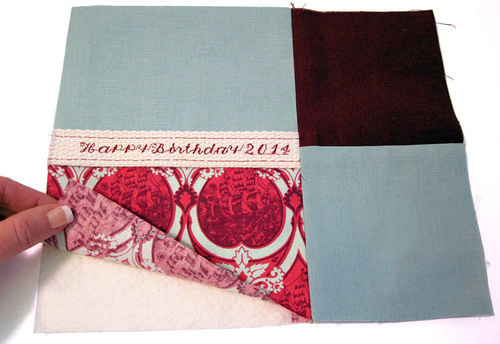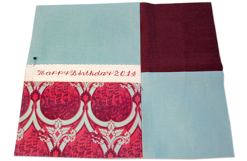 - This step is optional, but is actually one of our favorite parts of the project and a great way to play with the decorative stitch and monogramming functions on your sewing machine. We chose a Happy Birthday message; you could add a name, an anniversary date or a favorite quote. You could even leave out the message and just create a pretty line of decorative stitches.