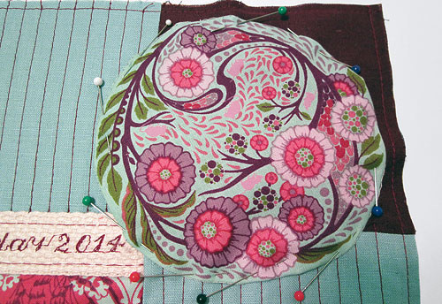 - From the print fabric for the bottom left quadrant (Sea of Tears in Pomegranate in our sample), fussy cut ONE 5″ high x 7″ wide rectangle.