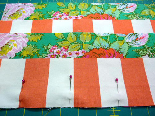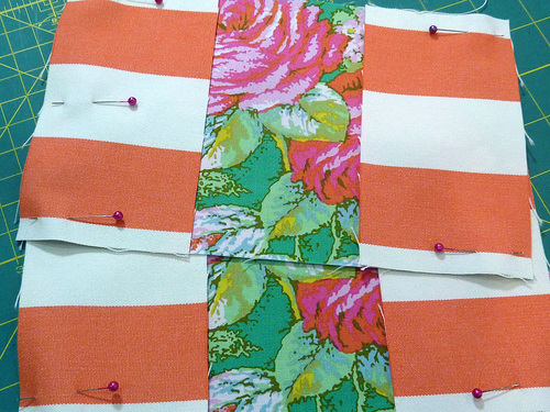 - On the small pouch, you have one center panel and two side panels for both the front and the back. Pin a side panel, right sides together, on either side of each center panel.