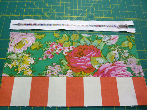 TWO 1¼” x 2½” strips for the zipper tabs; we cut from the white stripe to best match the white zipper; you could use whichever fabric you prefer - From the fabric for the upper panels, cut TWO 13” x 5” rectangles; we fussy cut to best center the largest flowers.