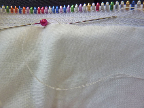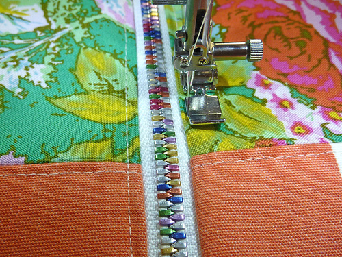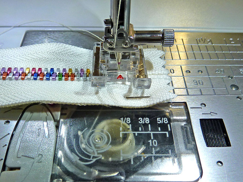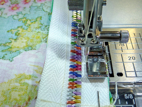 - When you can start to feel you’re approaching the zipper pull, stop with your needle in the down position. Twist your fabric around slightly and carefully close the zipper. Re-position your fabric and finish sewing to the end. Be very careful and go slowly; you want your seam line to be super-duper straight.
