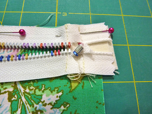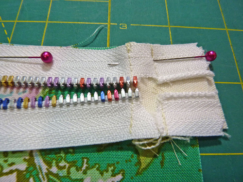 - We then clipped away the top zipper stop and one of the zipper teeth to allow a full ½” seam allowance along this side as well. If you use a 10” zipper, you can skip this step and simple center the zipper side to side.