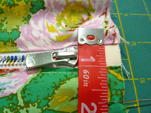 - Because the zipper we selected was almost as long as the top of the pouch, we cheated our zipper to the right, allowing a full ½”+ to the left of the zipper’s bottom stop for the seam allowance. At the top of the zipper, we stitched the end in place 1¼” from the raw edge of the panel, hand-walking the needle across the metal teeth of the zipper.