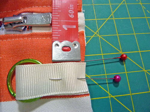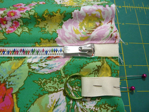 - Find the two zipper tabs, place one tab on each end of the zipper. The tab and the zipper are right sides together. Pin each tab in place.