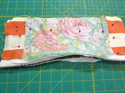 - Pin the layers together along the edge of the zipper.