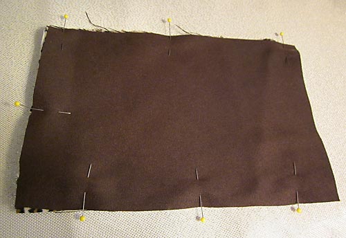 - Pin the fused exterior piece and the interior piece right sides together along both long sides and one short end.