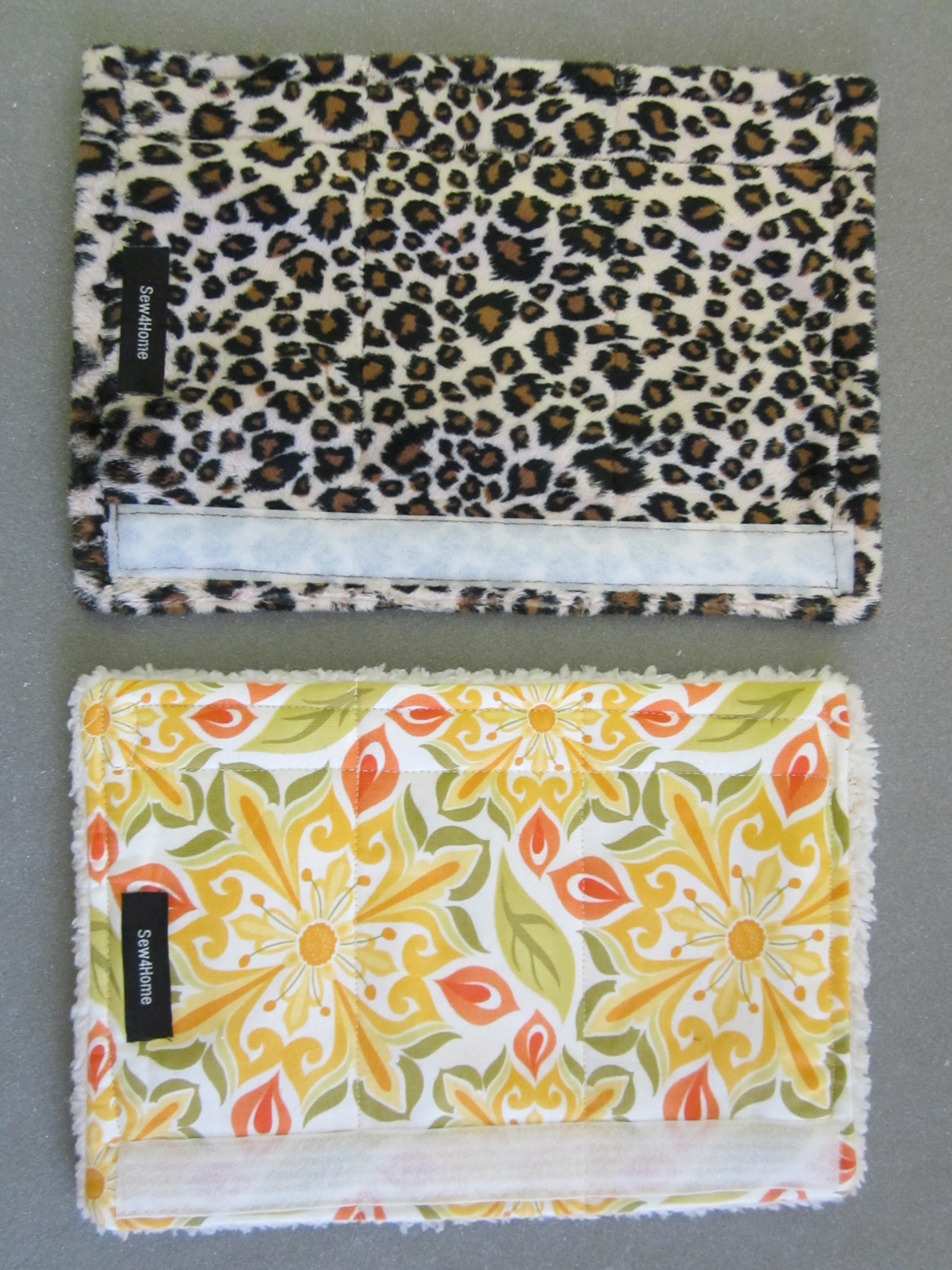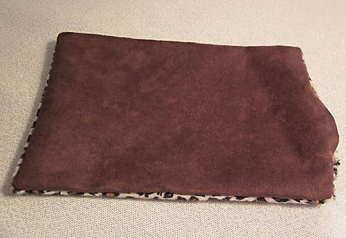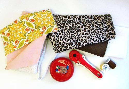 - Scraps or TWO coordinating ¼ yard cuts fabric: we originally dove into our scrap stash and picked out a beautiful cheetah print fleece and coordinating brown faux sued, as well as a bright cotton from Central Park by Kate Spade for Moda with a sherpa fleece. You need just 6½” x 10″ cuts of each fabric.